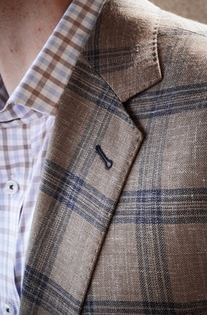 A classic navy and brown glen plaid jacket woven in a breathable blend of wool, linen, and silk. Lightweight yet structured — ideal for elegant everyday wear or semi-formal summer events.