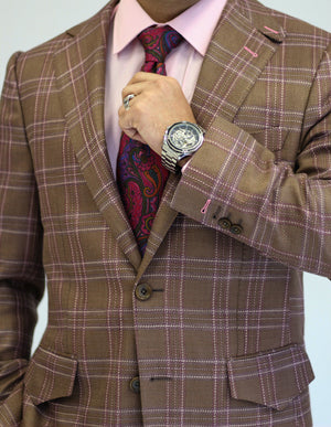 Eco-friendly elegance in a Cavani brown base with soft pink checks. Woven from bamboo wool, it delivers both sustainability and statement-making style.