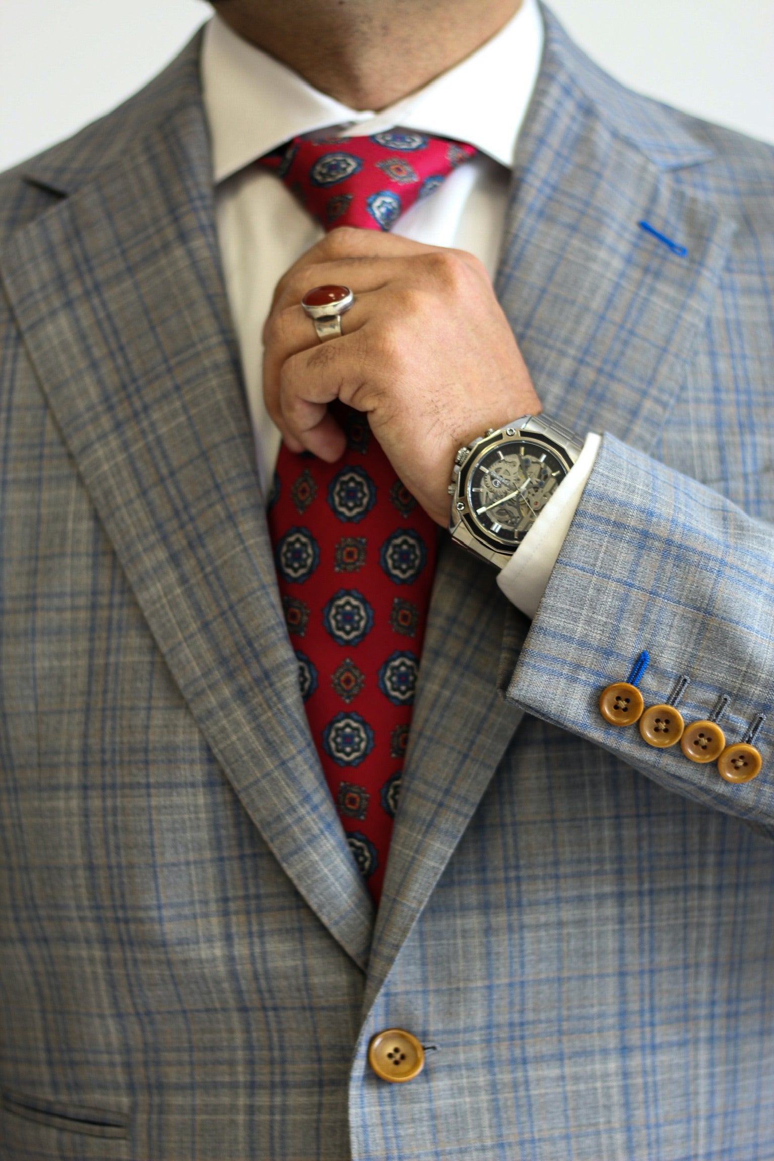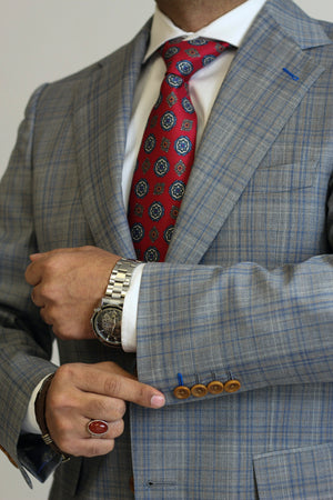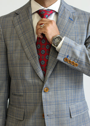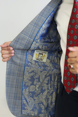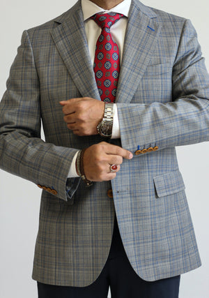 This refined suit in Signature Grey Glen Plaid with a subtle blue check is a perfect blend of classic and contemporary. Crafted for year-round comfort with a breathable wool blend, it;s ideal for professional settings and formal occasions alike.