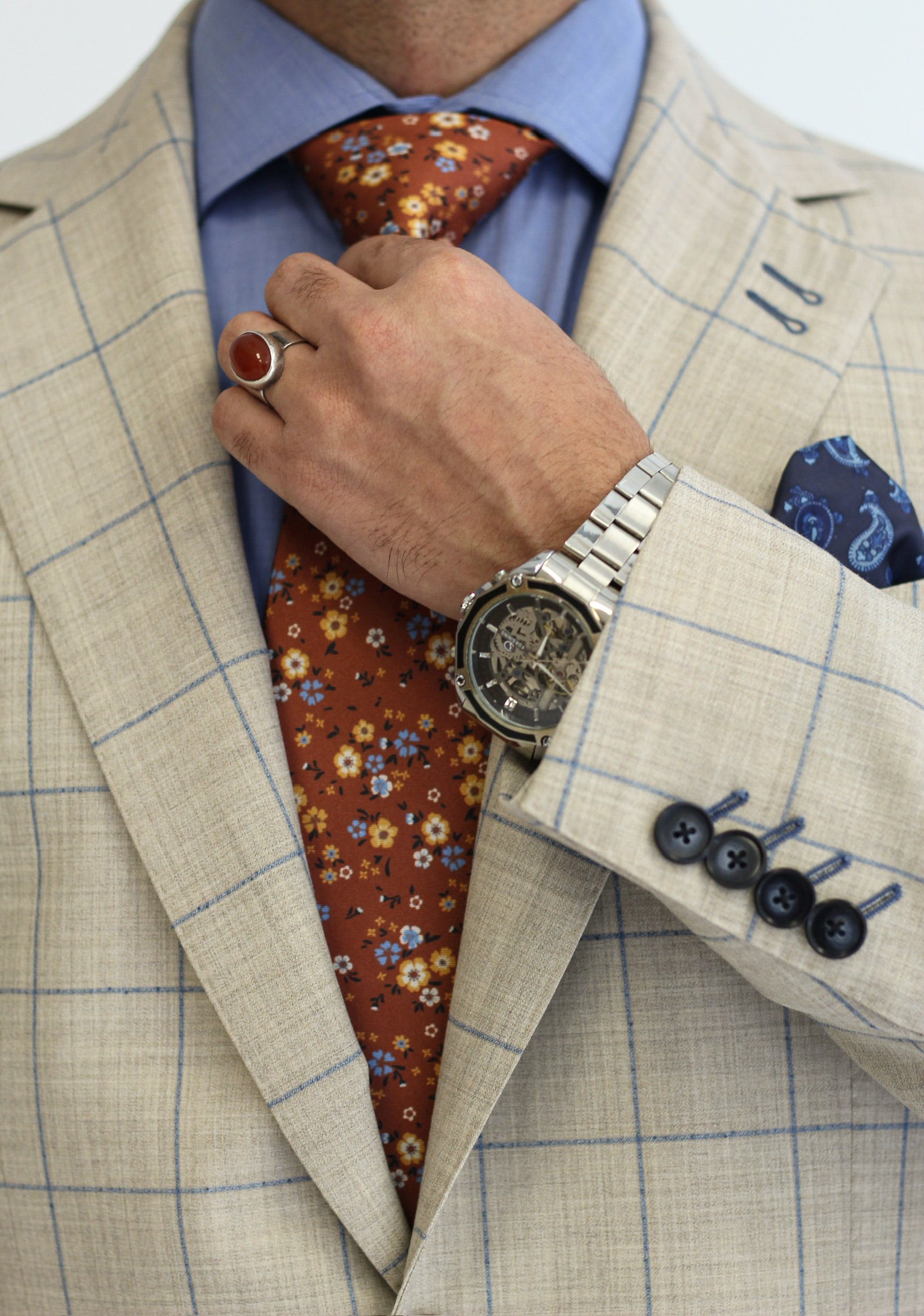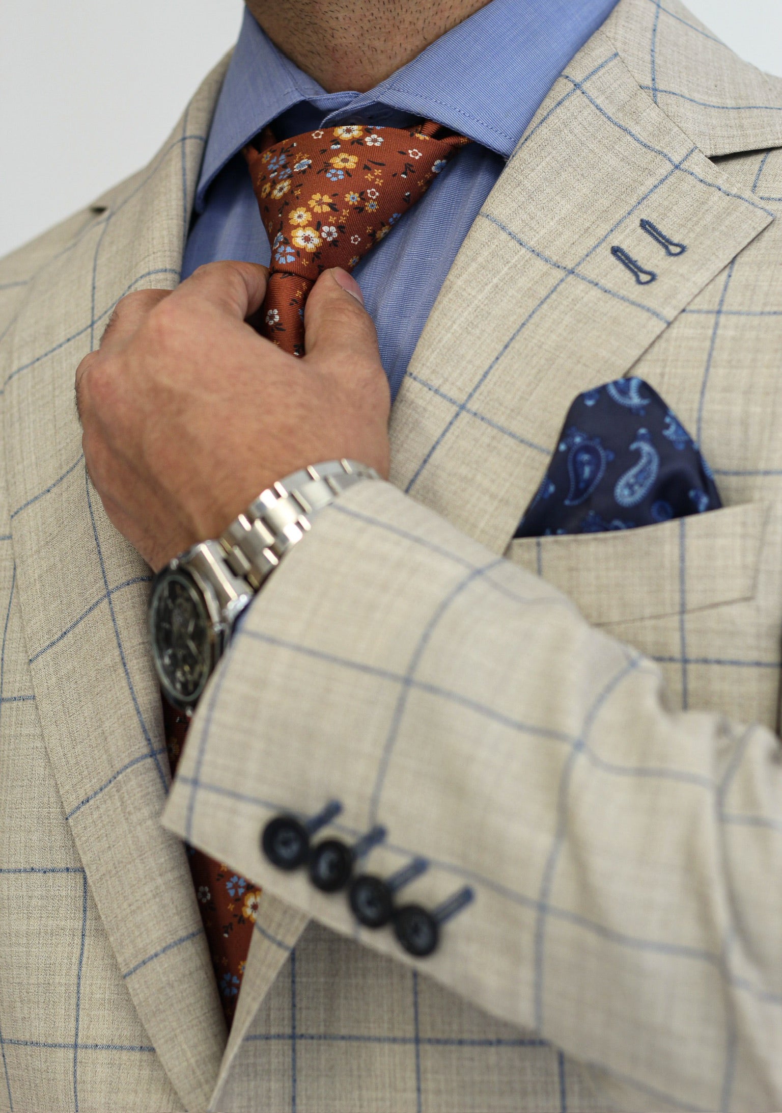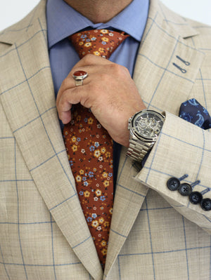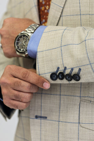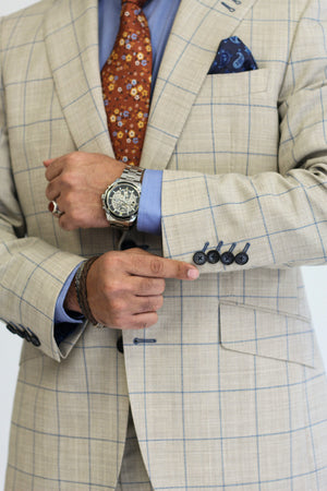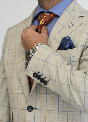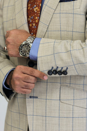Tailored in a light stone tone with blue and tan plaid, this breathable wool blend suit is perfect for weddings, garden parties, or adding a fresh flair to summer business meetings.
