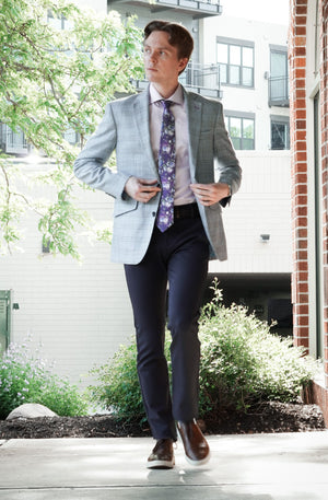 Crafted from an eco-friendly blend of bamboo, wool, linen & silk, this powder blue check jacket offers supreme breathability and luxurious comfort. Ideal for spring/summer styling with a soft touch and sustainable edge.